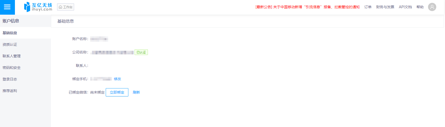 在基礎(chǔ)信息頁面,可直觀查看賬戶名稱、公司名稱(“已認(rèn)證”標(biāo)識代表資質(zhì)認(rèn)證完成 )、聯(lián)系人等信息。