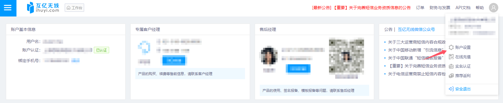 登錄互億無線平臺,點(diǎn)擊頁面右上角個(gè)人頭像,在彈出菜單選擇“賬戶設(shè)置”,進(jìn)入 賬戶信息 - 基礎(chǔ)信息 頁面,即可開展信息管理操作 。