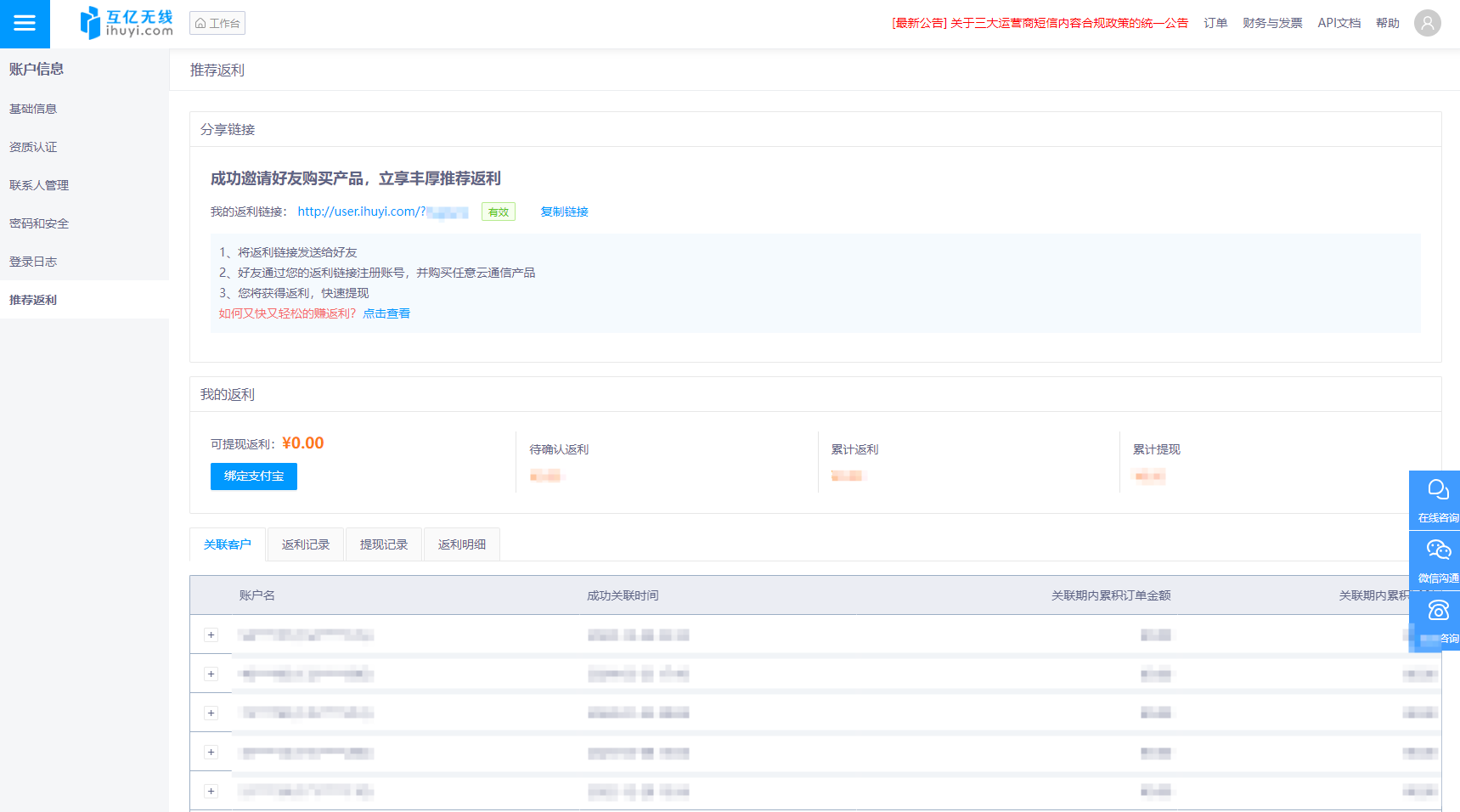 在 賬戶信息 - 推薦返利 頁(yè)面,可生成專屬返利鏈接,邀請(qǐng)好友購(gòu)買產(chǎn)品,成功交易后獲取返利;還能查看返利數(shù)據(jù)(可提現(xiàn)、待確認(rèn)等 )、關(guān)聯(lián)客戶信息,實(shí)現(xiàn)推廣收益管理 。