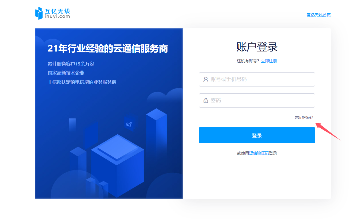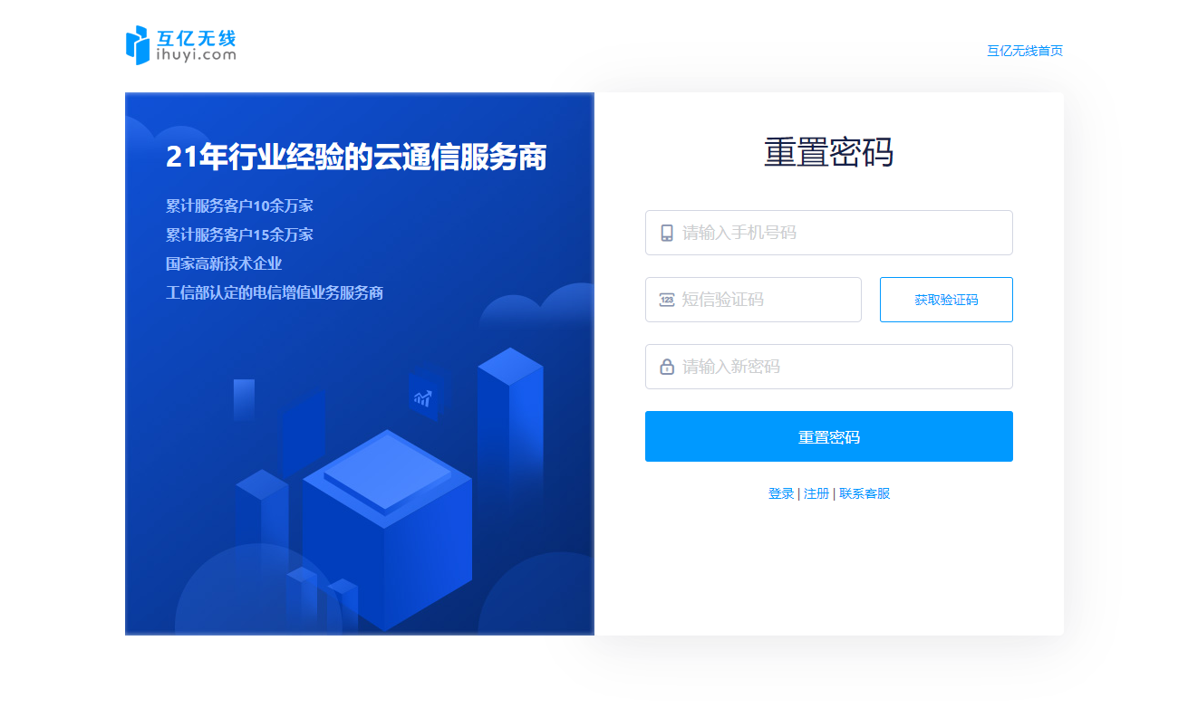 在互億無(wú)線 賬戶登錄 頁(yè)面,點(diǎn)擊【忘記密碼】按鈕,進(jìn)入“重置密碼”流程 。或者 點(diǎn)擊此鏈接重置密碼