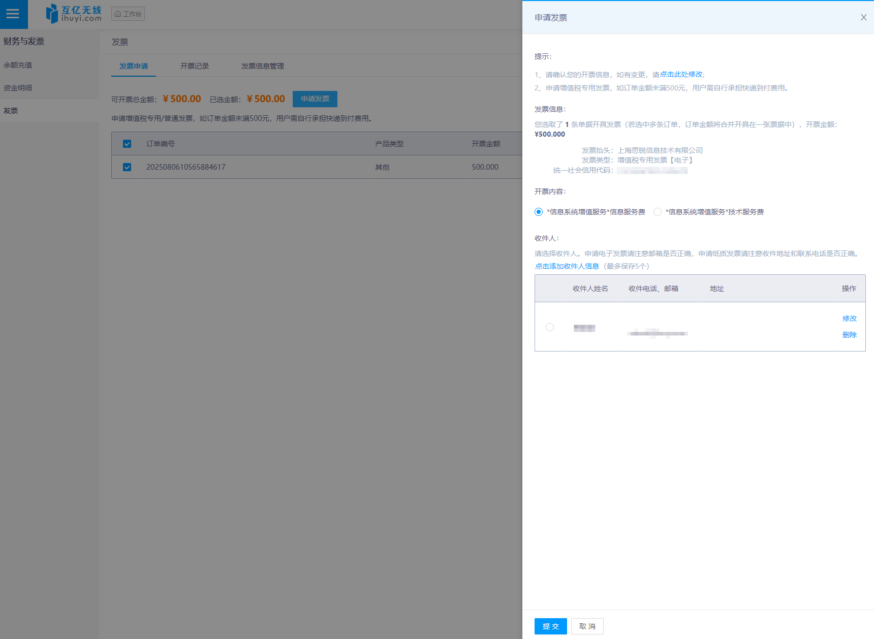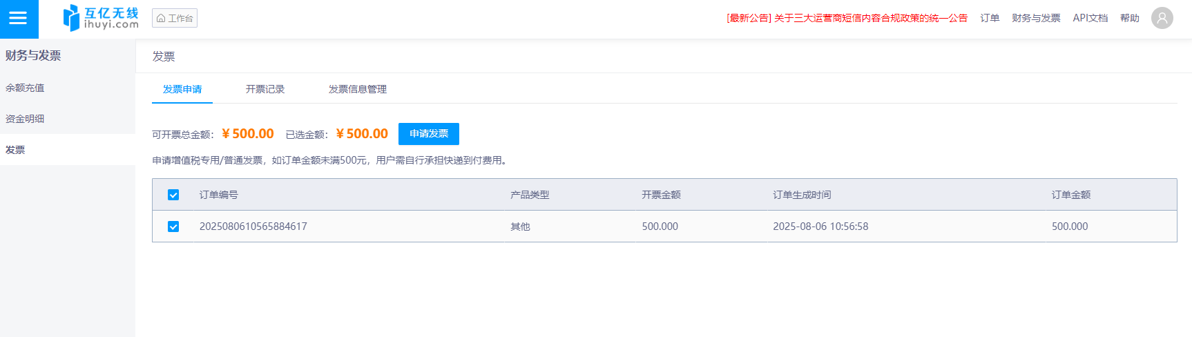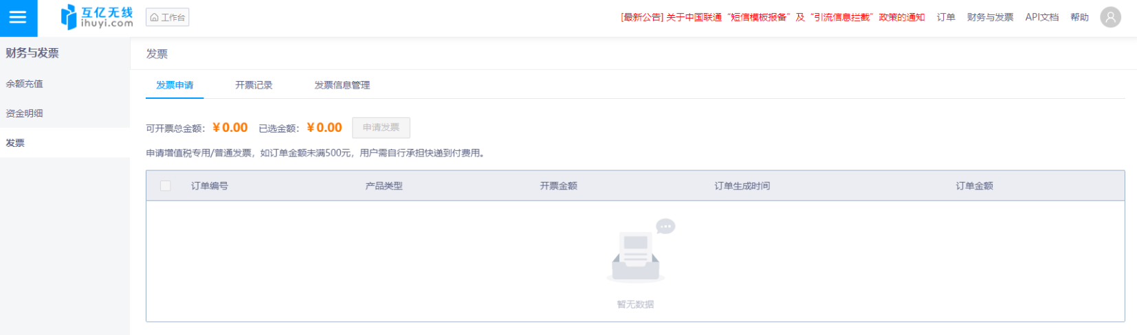 登錄互億無(wú)線平臺(tái),進(jìn)入 財(cái)務(wù)與發(fā)票 - 發(fā)票 - 發(fā)票申請(qǐng) 頁(yè)面 ,可查看“可開(kāi)票總金額”“已選金額”及訂單列表。