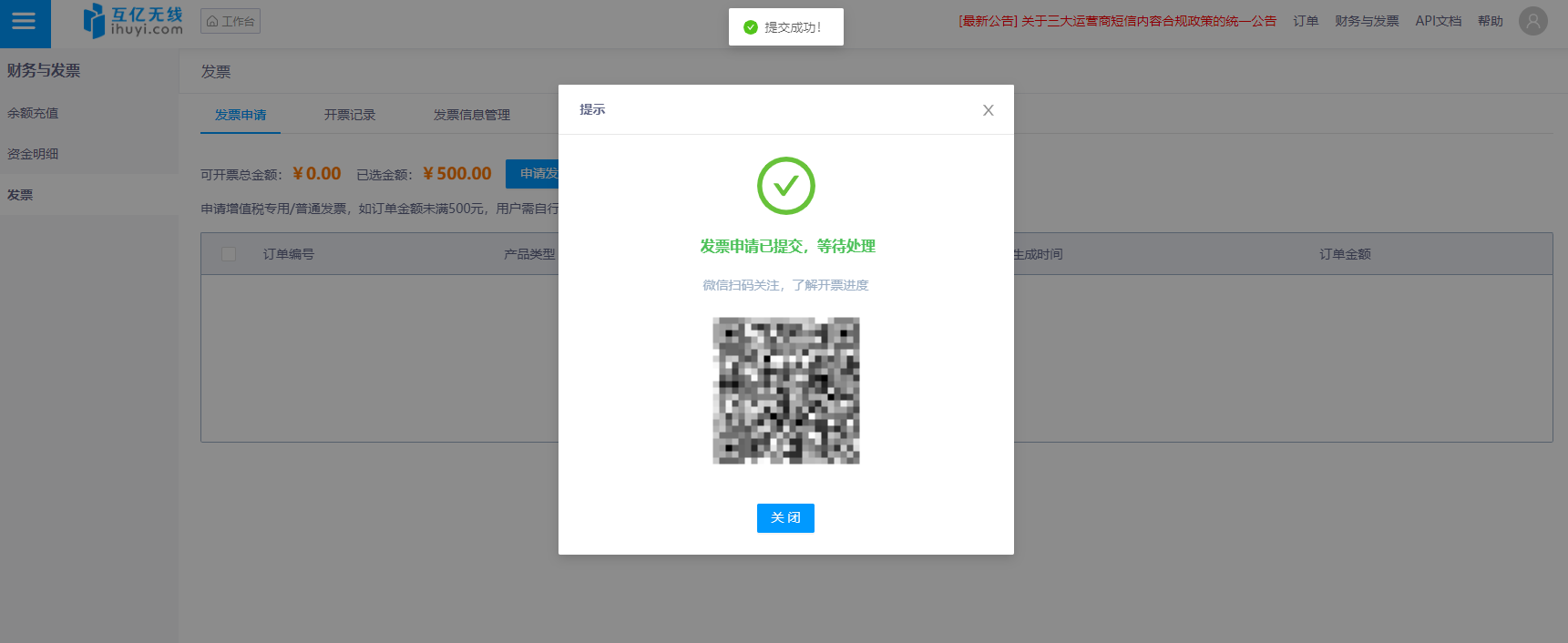 確認(rèn)信息無(wú)誤后,點(diǎn)擊【提交】按鈕,提交發(fā)票申請(qǐng) 。提交成功后,會(huì)彈出“發(fā)票申請(qǐng)已提交,等待處理”提示彈窗,可微信掃碼關(guān)注公眾號(hào)了解開(kāi)票進(jìn)度,點(diǎn)擊【關(guān)閉】按鈕關(guān)閉彈窗 。