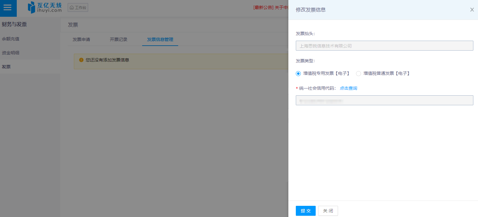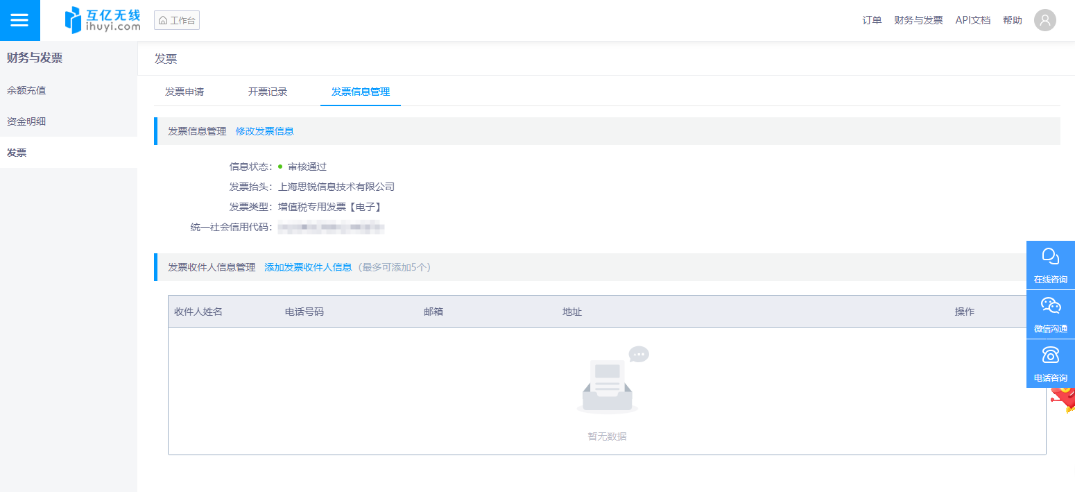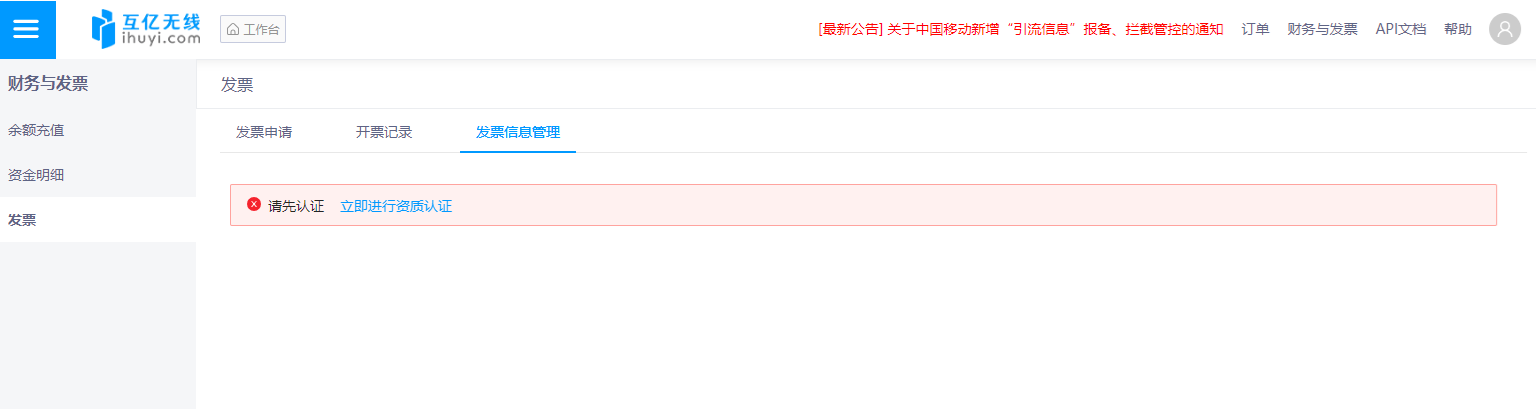 登錄互億無線平臺(tái),點(diǎn)擊頂部導(dǎo)航右上角,進(jìn)入 財(cái)務(wù)與發(fā)票 - 發(fā)票 - 發(fā)票信息管理 頁面 。若未完成資質(zhì)認(rèn)證,頁面會(huì)提示“請先認(rèn)證 立即進(jìn)行資質(zhì)認(rèn)證”。