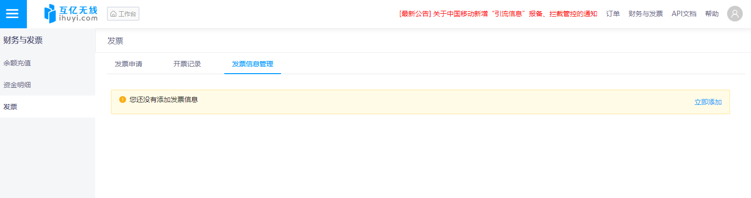 完成認(rèn)證后,頁面會(huì)提示“您還沒有添加發(fā)票信息 立即添加”。