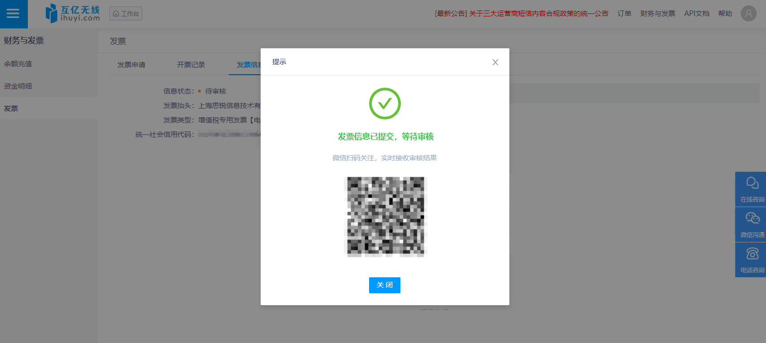提交發(fā)票信息后,會(huì)彈出提示彈窗,顯示 “發(fā)票信息已提交,等待審核” ,同時(shí)展示微信二維碼,引導(dǎo)您掃碼關(guān)注公眾號(hào),可實(shí)時(shí)接收審核結(jié)果通知 。