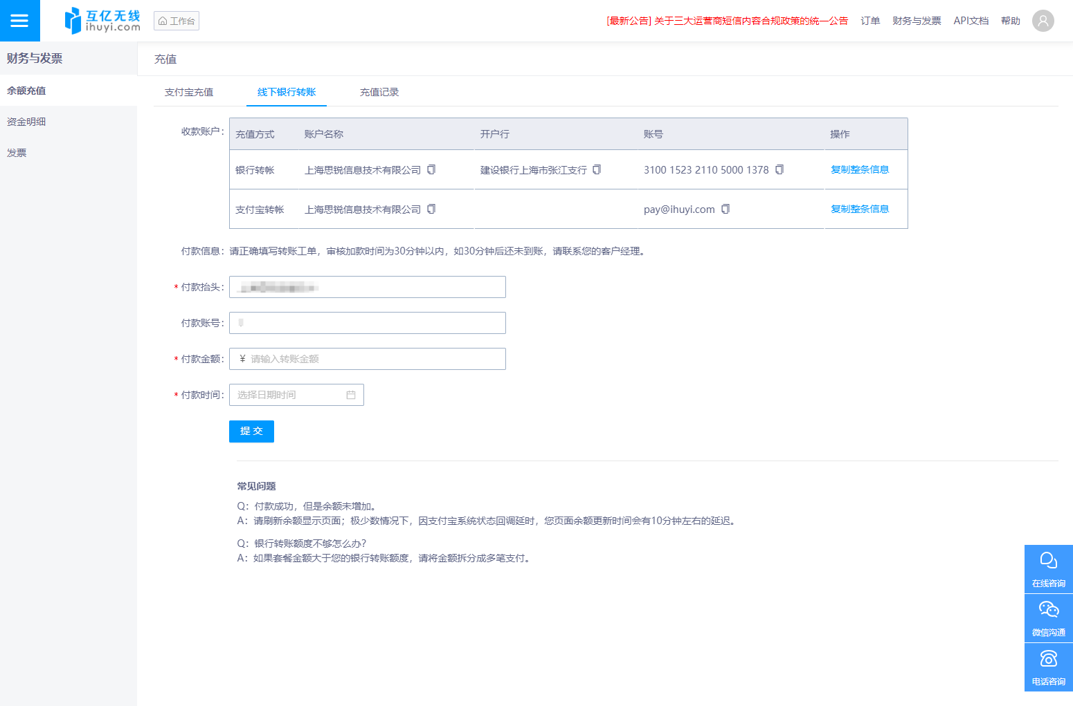 登錄互億無線平臺,依次進入 財務(wù)與發(fā)票 - 充值 - 線下銀行轉(zhuǎn)賬 頁面 ,即可看到收款賬戶信息、付款信息填寫區(qū)域及常見問題說明。