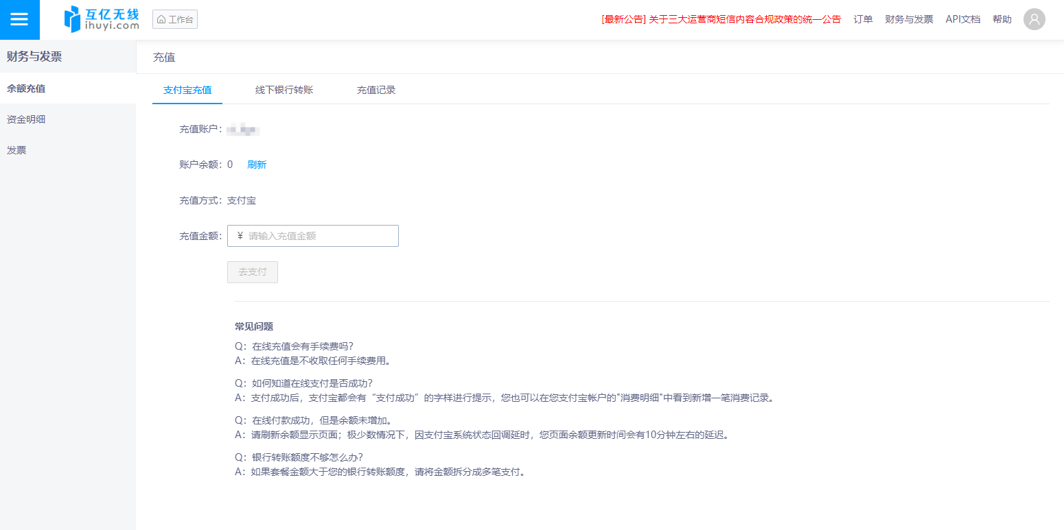登錄互億無線平臺,點擊頂部導(dǎo)航右上角,進入 財務(wù)與發(fā)票 - 充值 - 支付寶充值 頁面 ,即可看到充值相關(guān)界面,包含充值賬戶、賬戶余額、充值方式(默認(rèn)支付寶)、充值金額輸入框及“去支付”按鈕 。