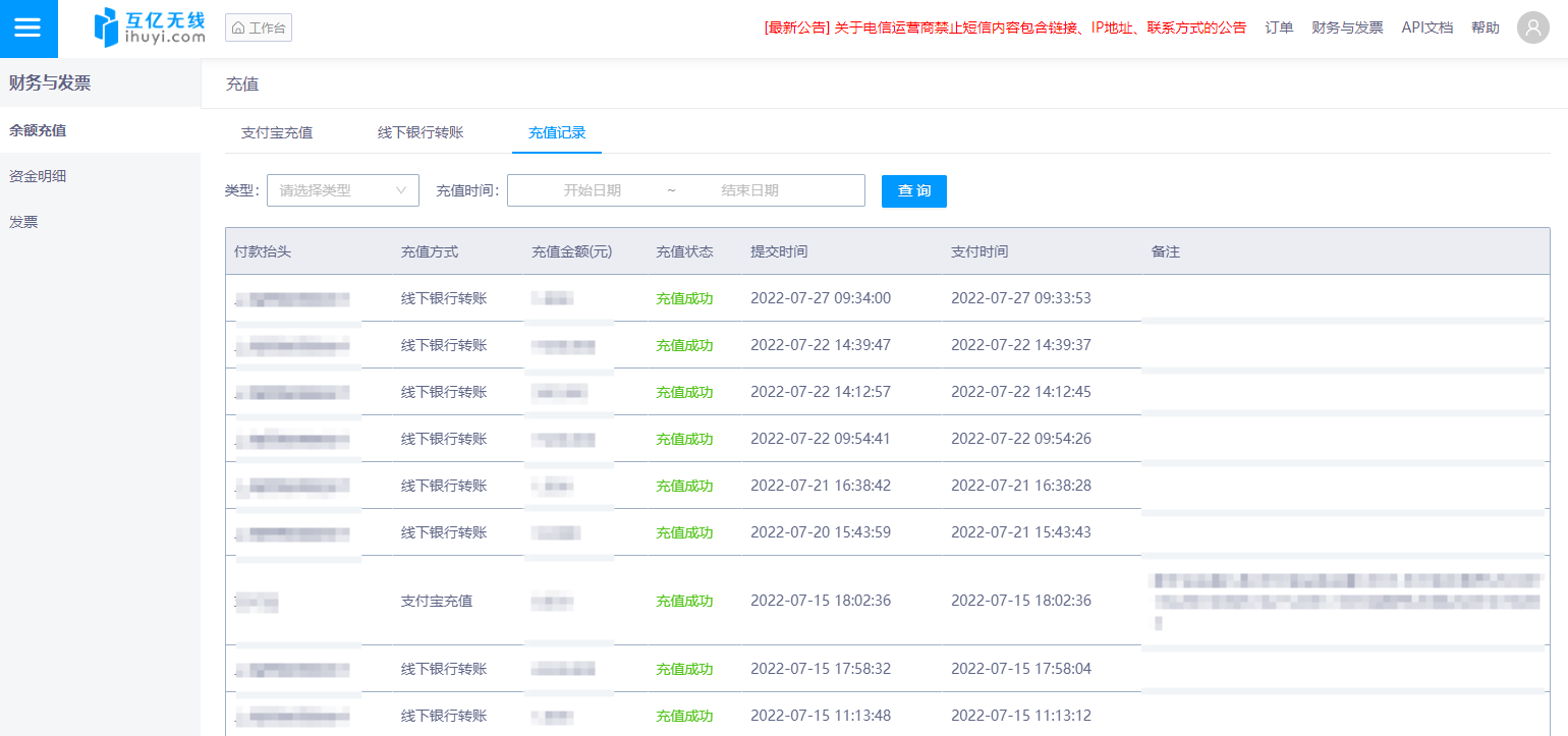 登錄互億無線平臺,點擊頂部菜單右上角,進入 財務與發(fā)票 - 充值 - 充值記錄 頁面 ,即可看到充值記錄查詢界面 。