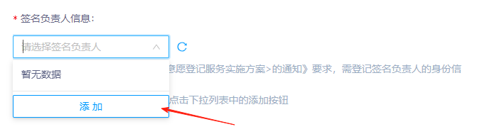 3、點(diǎn)擊“簽名負(fù)責(zé)人信息”下拉框,若無數(shù)據(jù),點(diǎn)擊【添加】按鈕。