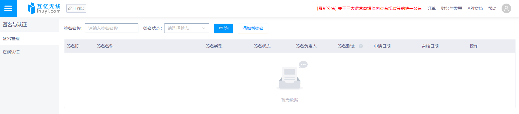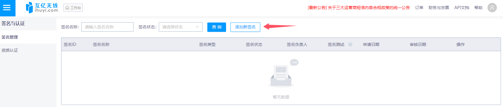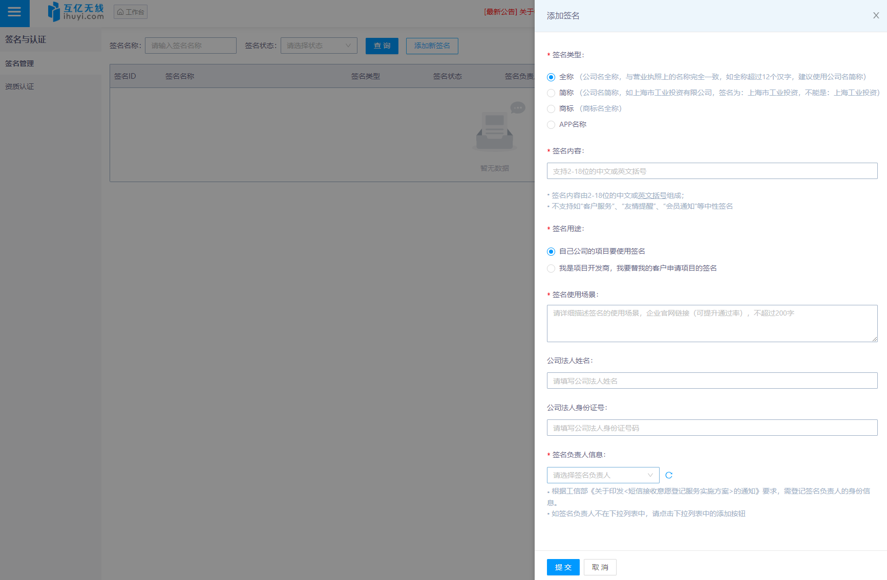 本流程指導(dǎo)您在互億無線平臺(tái)完成簽名的添加、提交及審核跟蹤,確保短信簽名合規(guī)可用。短信簽名可用于驗(yàn)證碼通知短信、營(yíng)銷短信、彩信、視頻短信等,不適用與國(guó)際短信。