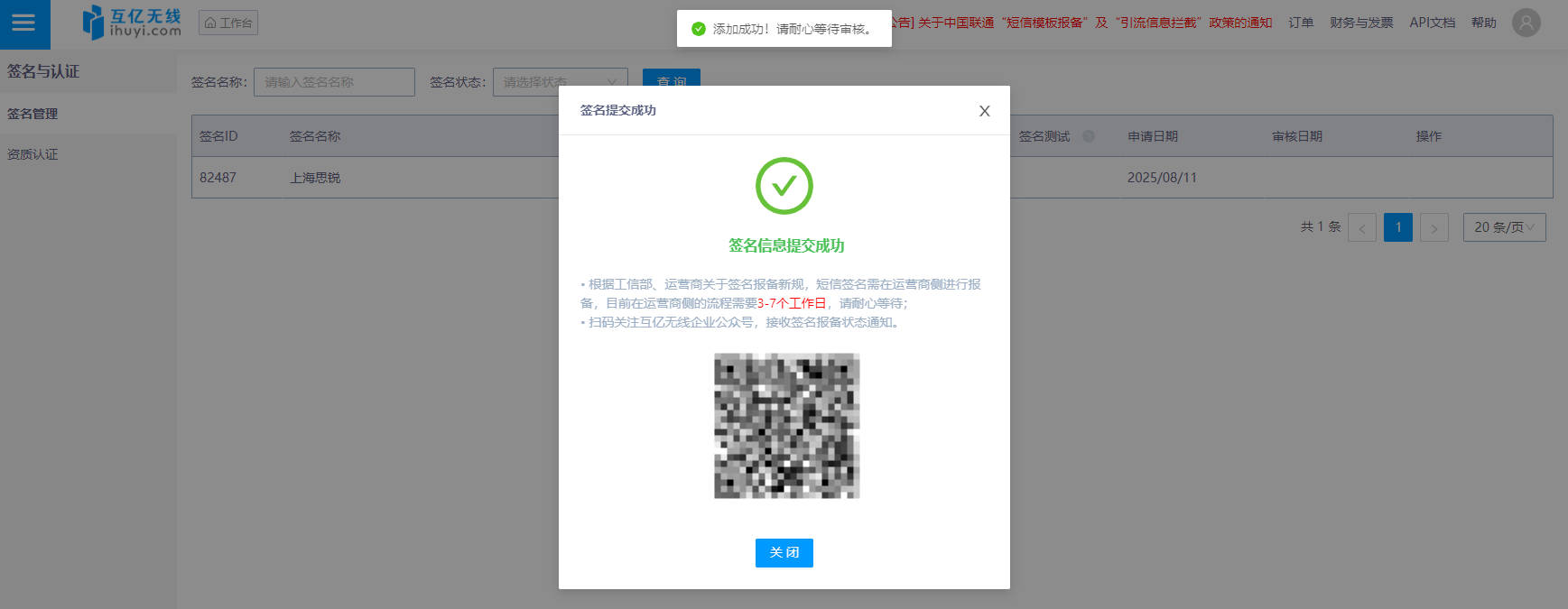 提交后,頁(yè)面會(huì)提示提交成功,您可以關(guān)注互億無線公眾號(hào)獲取報(bào)備狀態(tài)通知。