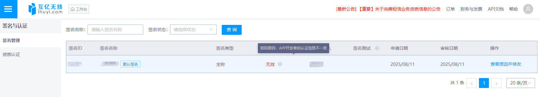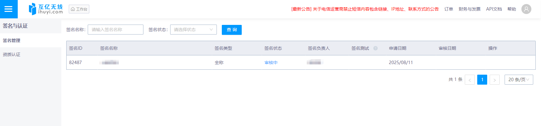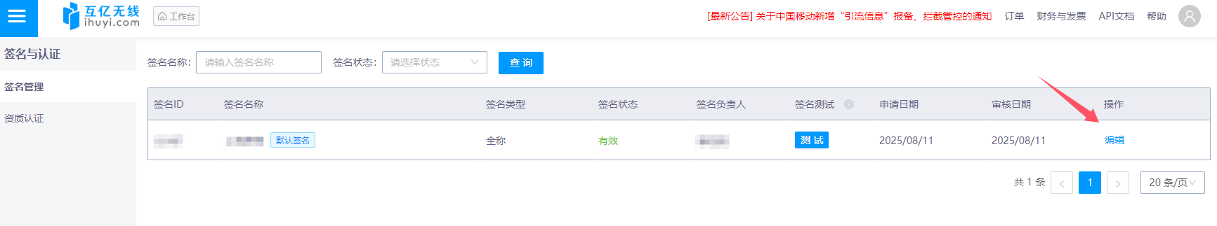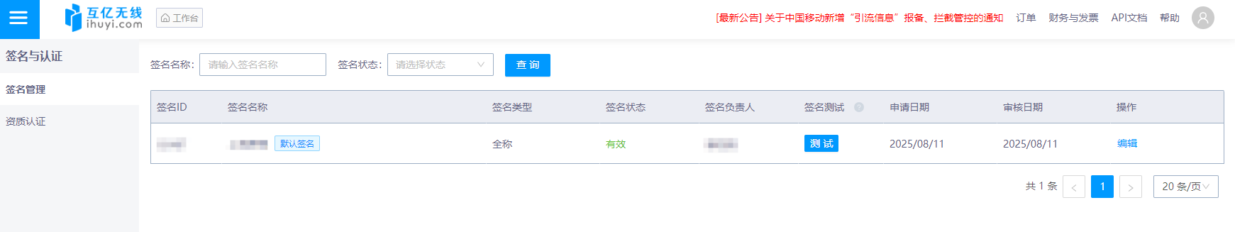 運(yùn)營(yíng)商審核完成后,簽名狀態(tài)將更新為“有效”。