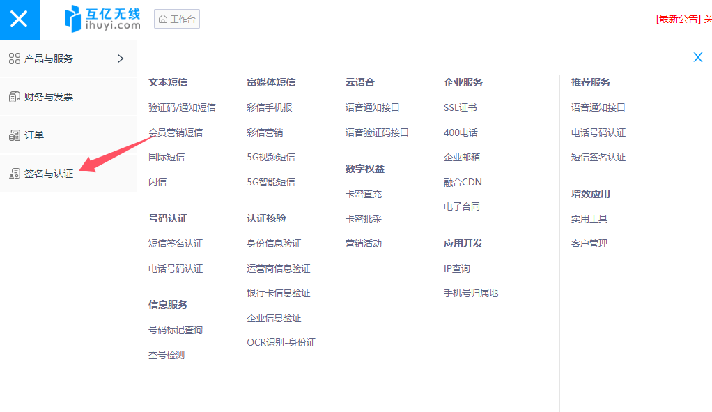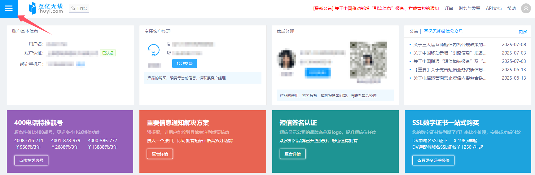 1、登錄互億無線平臺(tái),點(diǎn)擊左上角 “三” 菜單。
