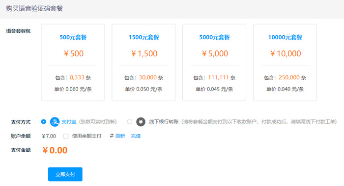 3、在線自助購買語音驗(yàn)證碼服務(wù)
