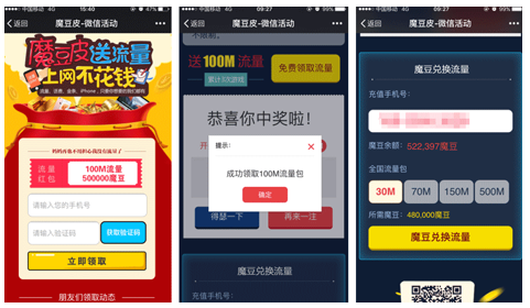 商家通過開展流量獎勵營銷活動,極大的吸引了用戶參與,并引導注冊網(wǎng)站會員、下載APP。參與新用戶通過微信進入活動頁面,輸入自己的手機號碼注冊,并參與游戲即可領取100M流量?;顒有问胶唵?,獎品即時到賬,使得用戶的積極性大大提升。同時流量獎品覆蓋了移動、聯(lián)通、電信三大運營商,使得活動人群、地域不受限制,易被用戶推廣到朋友圈中,又引起了用戶間的多次自發(fā)營銷,快速擴大了魔豆皮的知名度,而參與用戶的真實手機號又方便了應用的后續(xù)營銷及活動推廣。