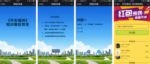 除了企業(yè)選擇有獎(jiǎng)競(jìng)答推廣品牌外,政府服務(wù)類微信公眾號(hào)也會(huì)選擇知識(shí)競(jìng)答的方式來普及一些公民必需的知識(shí)。微信公眾號(hào)平安福州就舉行過“青少年法律知識(shí)微信競(jìng)答活動(dòng)”和“綜治知識(shí)競(jìng)答活動(dòng)”來宣傳普及相應(yīng)的法律知識(shí)和常識(shí)。市民們?cè)诖痤}的過程中學(xué)到了有用的知識(shí),獲得了免費(fèi)的手機(jī)流量包,而政府方面則增大了粉絲量,為日后政府更全民的信息服務(wù)打下了基礎(chǔ),可以說是一個(gè)雙贏的局面。