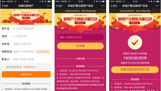 如何快速的開展手機流量獎勵營銷呢?那以注冊送流量為例,商家只需要在互億無線流量平臺生成活動鏈接,將該鏈接加入到注冊成功頁面,這樣注冊成功的用戶就能直接領取流量,并主動將活動分享到社交媒體中,吸引更多的用戶來參與注冊搶流量的活動。