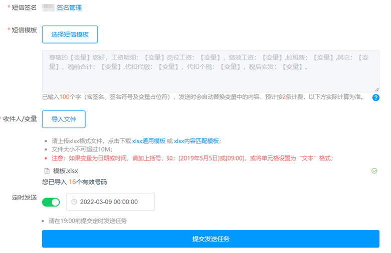 工資條短信內(nèi)容確認(rèn)無誤后,即可提交發(fā)送;平臺同時支持立即發(fā)送與定時發(fā)送;