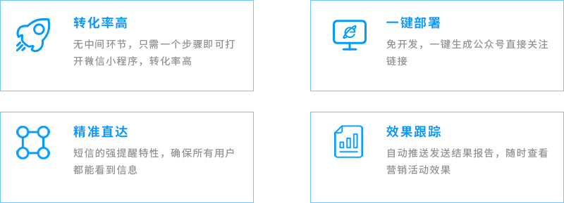 眾所周知,短信是一種性價比非常高的營銷手段;借助短信營銷方式,結(jié)合一鍵跳轉(zhuǎn)微信小程序的功能,可以實(shí)現(xiàn)用戶訪問小程序的最短路徑,極大增加用戶的轉(zhuǎn)化率。