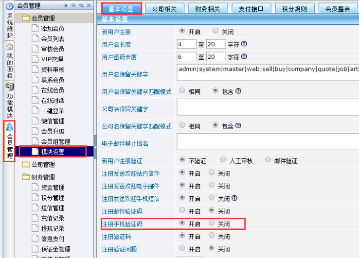 - 2、打開Destoonb2b_V5.0網(wǎng)站管理系統(tǒng)后臺(tái)-》會(huì)員管理-》模塊設(shè)置-》基本設(shè)置,注冊驗(yàn)證碼功能開啟;