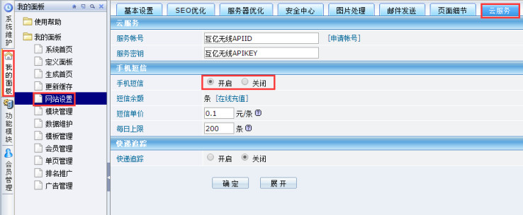 - 3、打開Destoonb2b_V5.0網(wǎng)站管理系統(tǒng)后臺(tái)-》我的面板-》網(wǎng)站設(shè)置-》云服務(wù),手機(jī)短信功能開啟。