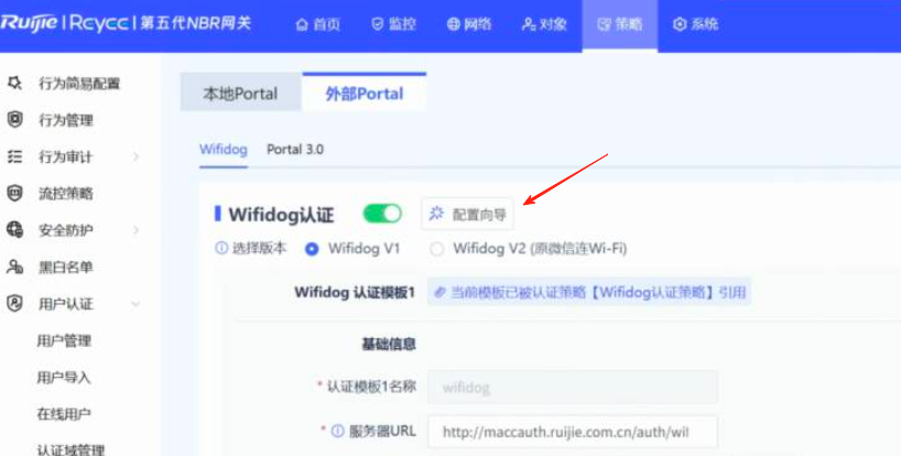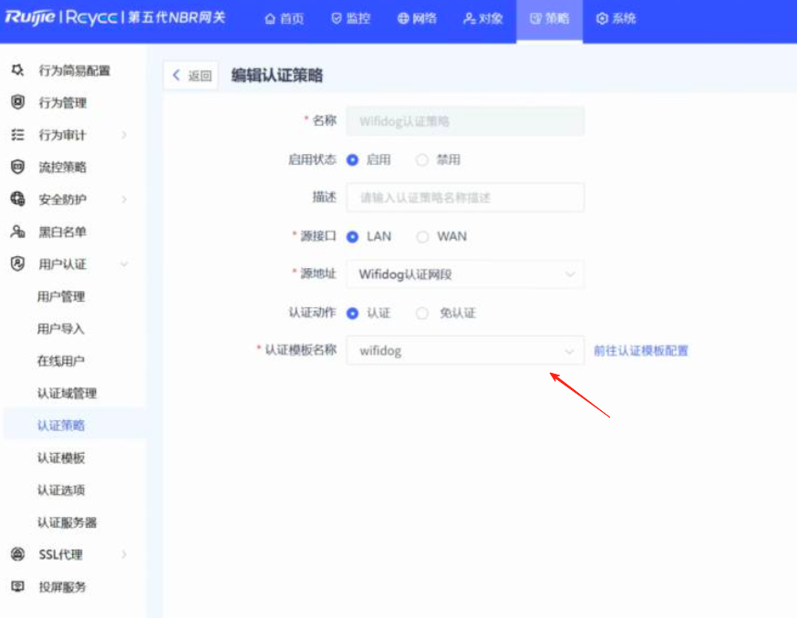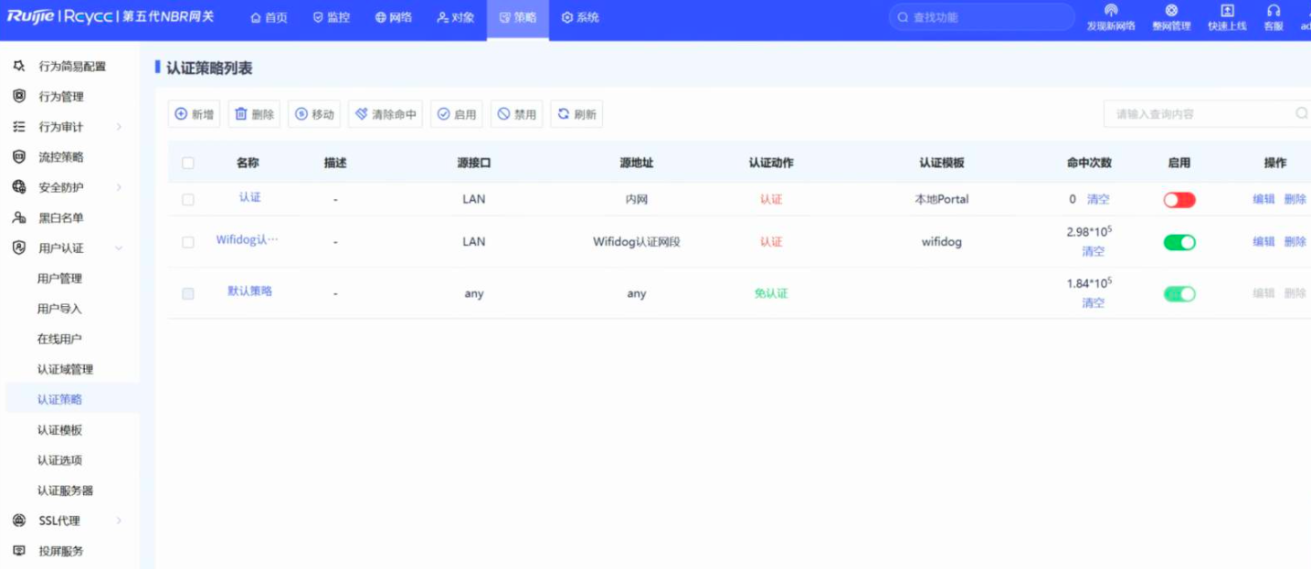 4、點(diǎn)擊左側(cè)菜單【用戶認(rèn)證 - 認(rèn)證策略】,編輯“wifidog認(rèn)證策略”,并確保該策略是啟用狀態(tài)。