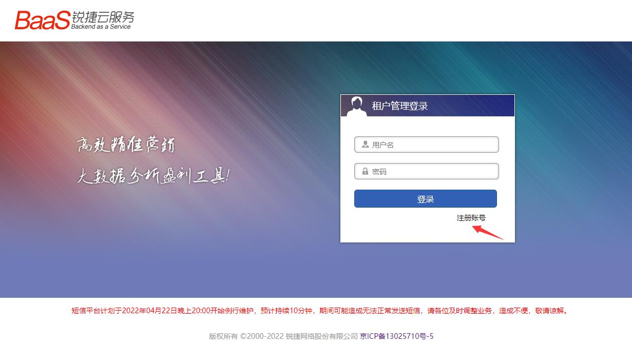 1、訪問(wèn)BasS銳捷云平臺(tái):https://baas.rj.link/,點(diǎn)擊頁(yè)面上【注冊(cè)賬號(hào)】按鈕,進(jìn)入baas賬號(hào)申請(qǐng)頁(yè)面。