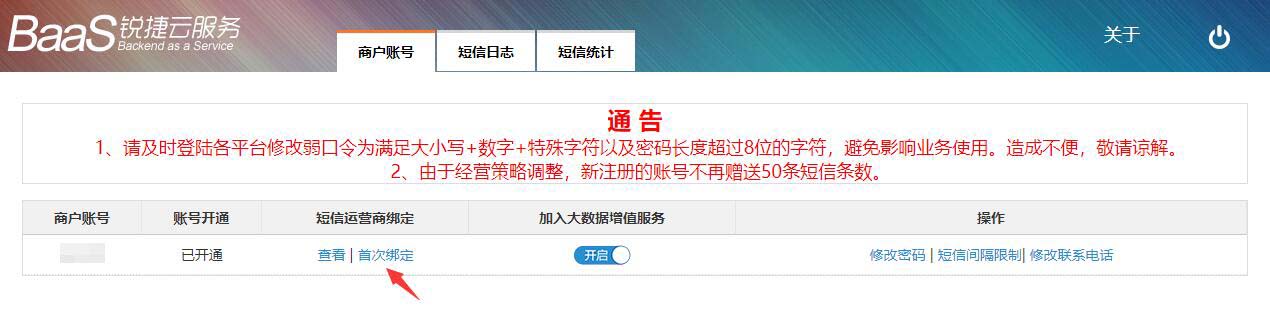 3、注冊(cè)成功后進(jìn)入BaaS系統(tǒng)主頁(yè),點(diǎn)擊【首次綁定】按鈕。
