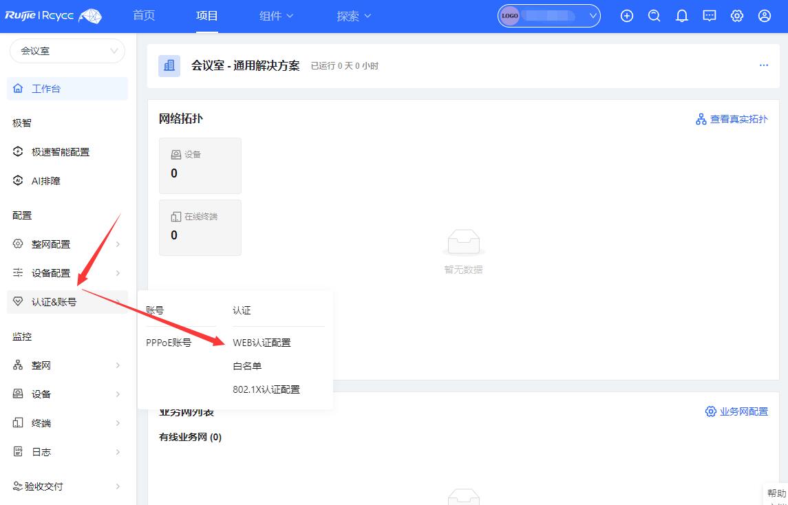 6、點(diǎn)擊左側(cè)菜單“配置 -> 認(rèn)證&賬號(hào) -> WEB認(rèn)證配置”。