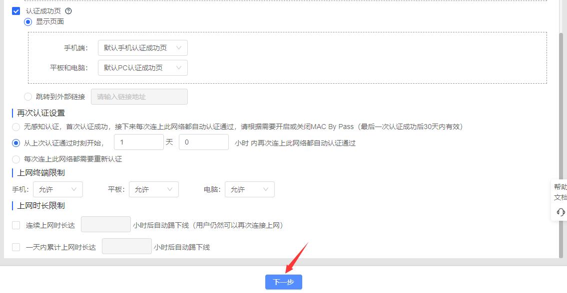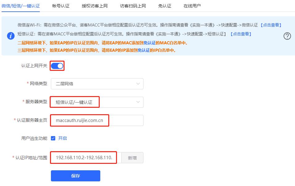 認(rèn)證IP地址/范圍:輸入要認(rèn)證的終端IP地址范圍,如192.168.110.2-192.168.110.254,其余即可直接免認(rèn)證