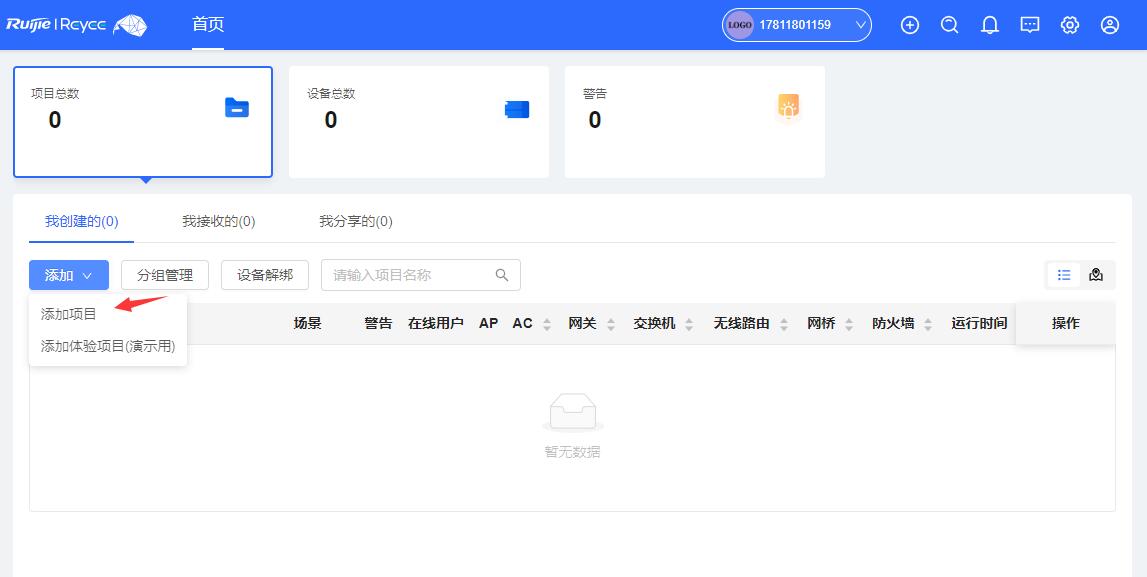 3、進(jìn)入諾客云管理平臺(tái),點(diǎn)擊“添加 -> 添加項(xiàng)目”。