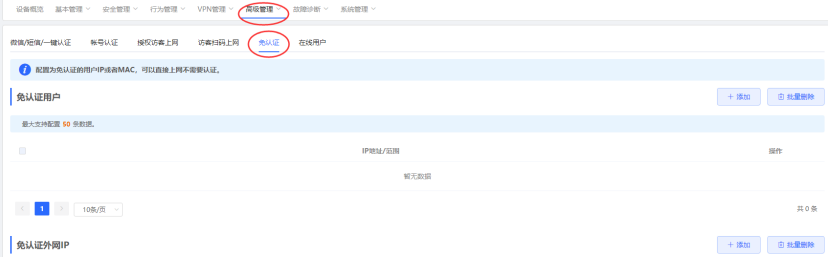 3、內(nèi)網(wǎng)不需要認(rèn)證的,比如打印機(jī),電腦,或部分用戶,可以將IP地址添加到免認(rèn)證里面,這些用戶即可不用認(rèn)證直接上網(wǎng)。