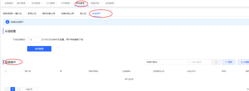 下線檢測(cè):終端在一定時(shí)間內(nèi)的流量小于設(shè)定值時(shí)將被設(shè)備下線。