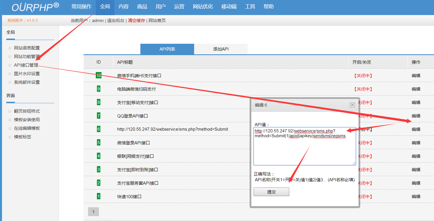 2、進(jìn)入系統(tǒng)后臺(tái)->全局->api接口管理->手機(jī)短信(6),填寫(xiě)參數(shù)(apiid和apikey自行填寫(xiě))