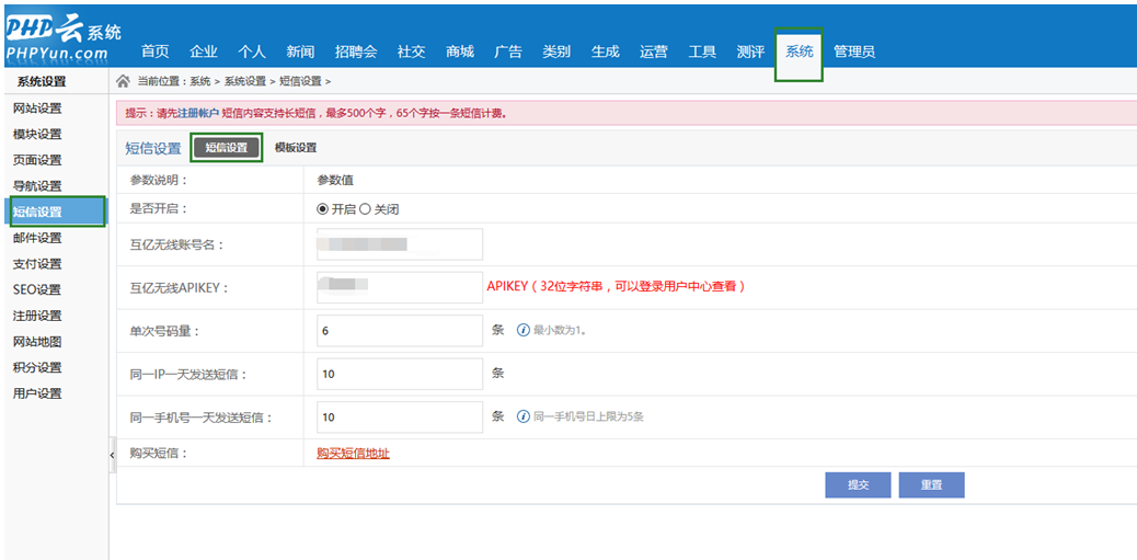 - 2、進(jìn)入系統(tǒng)后臺(tái)-》系統(tǒng)-》短信設(shè)置,填寫你的短信參數(shù)(使用短信務(wù)必開(kāi)啟短信功能);
