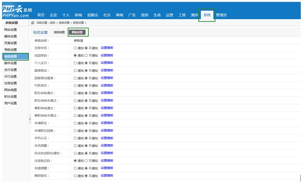 - 3、進(jìn)入系統(tǒng)后臺(tái)-》系統(tǒng)-》短信模板,開(kāi)啟和編輯相應(yīng)的短信模板;