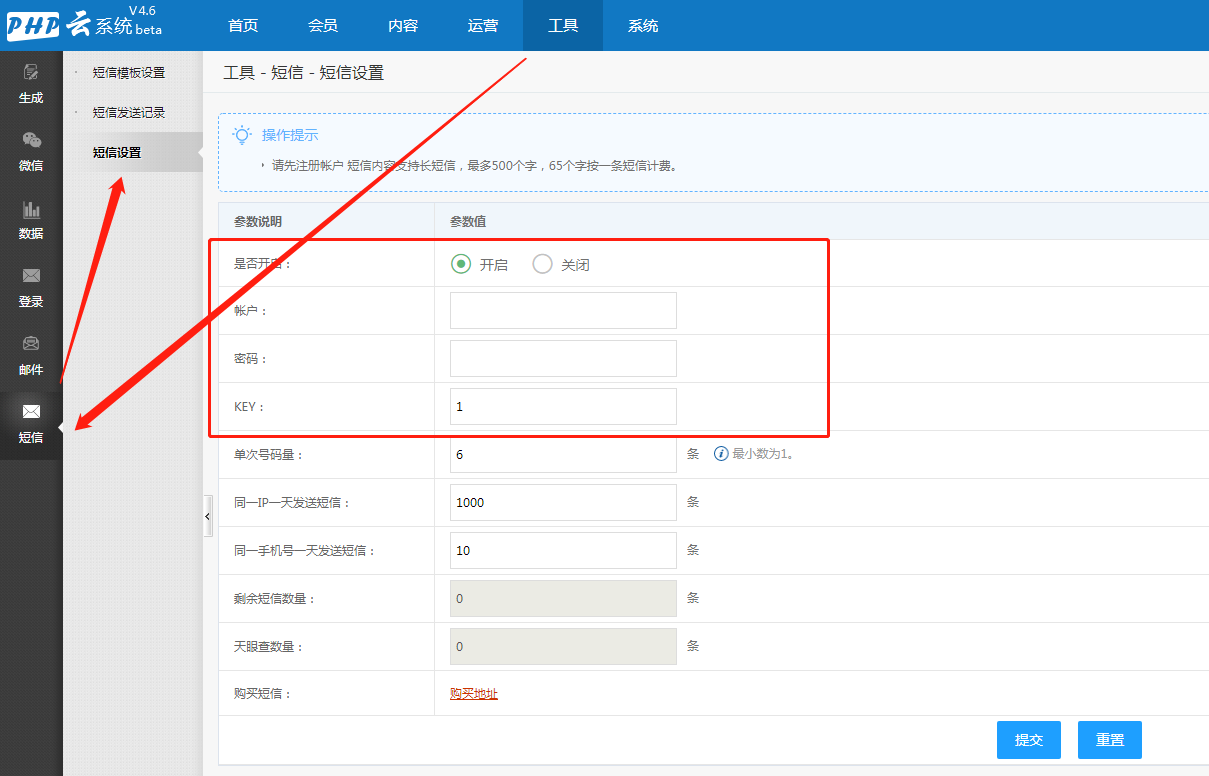2、進入系統(tǒng)后臺. 填寫相關信息相關參數(shù) ( 查看apiid和apikey 可點擊http://user.ihuyi.com/nav/sms.html )