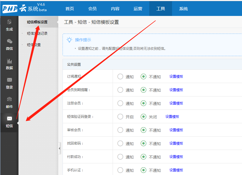 3、選擇需要發(fā)送短信的情景,設置相應短信模板 如短信發(fā)送時提示4072為模板不匹配 可自行報備模板 或聯(lián)系互億無線客服
