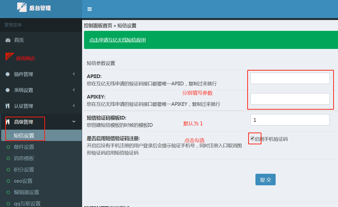 高級管理->短信設置,填寫短信參數(shù)(APIID/APIKEY)