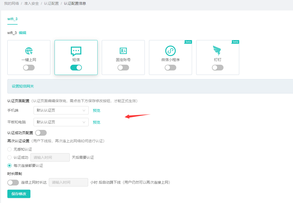 [ 基于SSID認(rèn)證] 設(shè)備對(duì)應(yīng)的SSID使用該認(rèn)證,配置SSID認(rèn)證時(shí),需要在配置頁(yè)面填入設(shè)備上配置的SSID名稱,此處填完后,后臺(tái)會(huì)自動(dòng)匹配設(shè)備上的SSID;