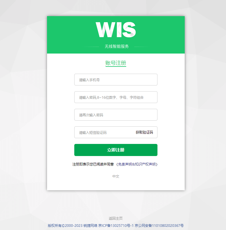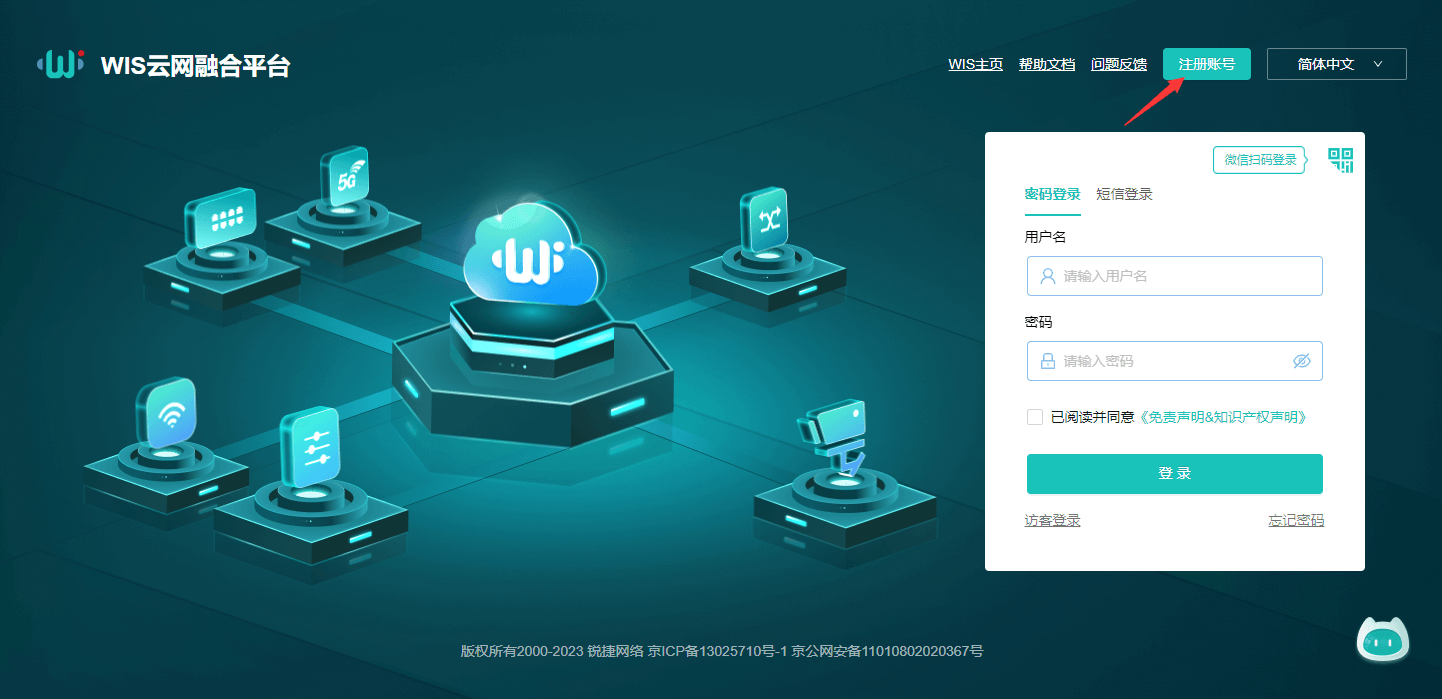 如果您還沒(méi)有WIS 5.0云管平臺(tái)的賬號(hào),可以點(diǎn)擊右上角的【注冊(cè)賬號(hào)】按鈕。