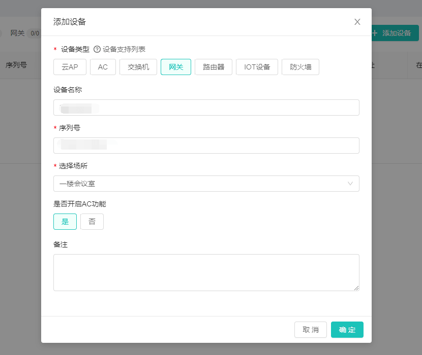 在彈出的窗口中,選擇設(shè)備類型、場(chǎng)所,填寫設(shè)備名稱、序列號(hào)信息后,點(diǎn)擊【確定】按鈕。
