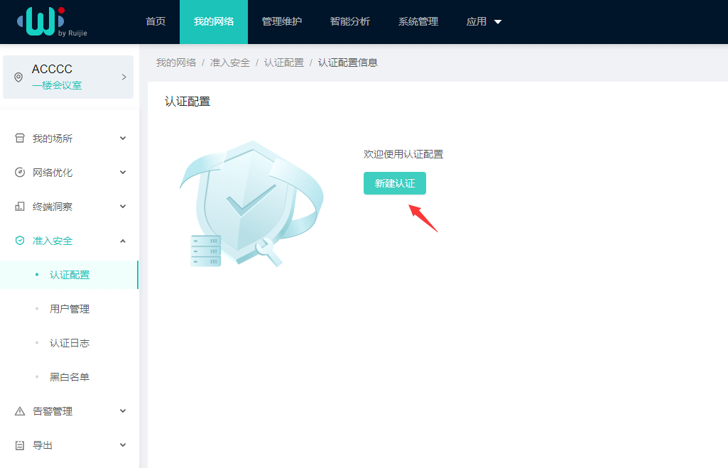 點(diǎn)擊左側(cè)菜單“準(zhǔn)入安全 -> 認(rèn)證配置”。在右側(cè)場(chǎng)所列表中,點(diǎn)擊需要配置的場(chǎng)所名稱。