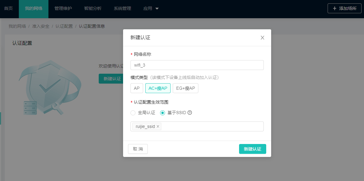 認(rèn)證配置生效范圍:配置全局認(rèn)證和基于SSID認(rèn)證(注:一個(gè)場(chǎng)所下只允許存在一個(gè)全局認(rèn)證。)