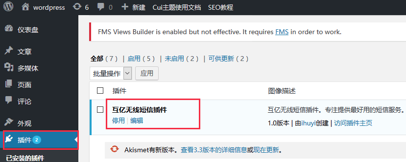 進(jìn)入到后臺 –>插件找到 互億無線短信插件 并啟用