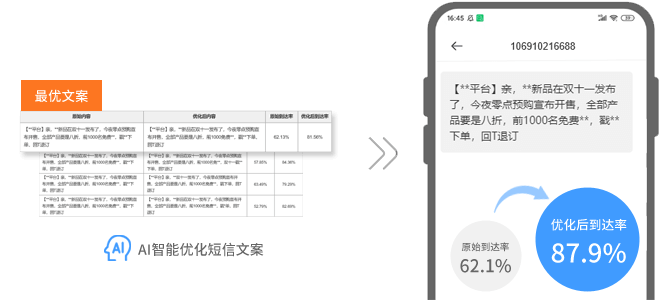 對內容進行語義分析,并結合AIGC技術自動優(yōu)化短信文案,提升短信內容質量,并從多內容方案中挑選出到達率最優(yōu)的,提升營銷活動的轉化率